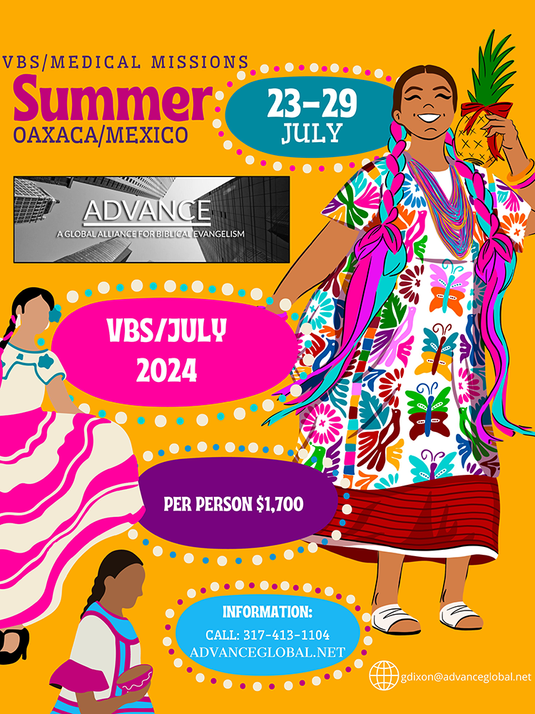 The last seven years each participant in VBS and our MEDICAL MISSION TEAM has had a great opportunity to serve and minister in wonderful life changing ways. Once again, we will converge on Oaxaca to make an ETERNAL impact.WHERE: Oaxaca, MexicoWHEN: July 23- 29 2024COST: $1,700.00 per personHOSTS: Pastors Edmundo and PacoMy goal is to not only impact the lives of the Mexican people and churches, but also to influence each one who goes to come home CHANGED from the inside out.Please feel free to bring a friend. Word of mouth from you is the best advertisement for the trip.Below is the schedule for monthly payments:FIRST PAYMENT – APRIL 1 – $500.00 to secure plane tickets. When you commit to go and our first installment is paid, your ticket will be purchased.SECOND PAYMENT – MAY 1st – $500.00THIRD PAYMENT – JUNE 1st – $500.00FORTH PAYMENT – JULY 1st – $200.00The first fifteen people to respond will have a place secure for them. Thanks in advance for participating.